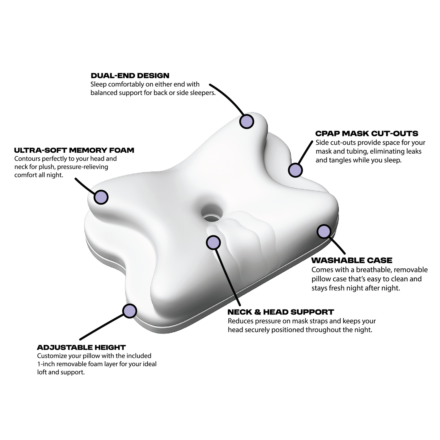 Ideal for back sleepers, a contoured center cradle supports head and neck alignment while keeping your mask stable and secure for uninterrupted therapy.