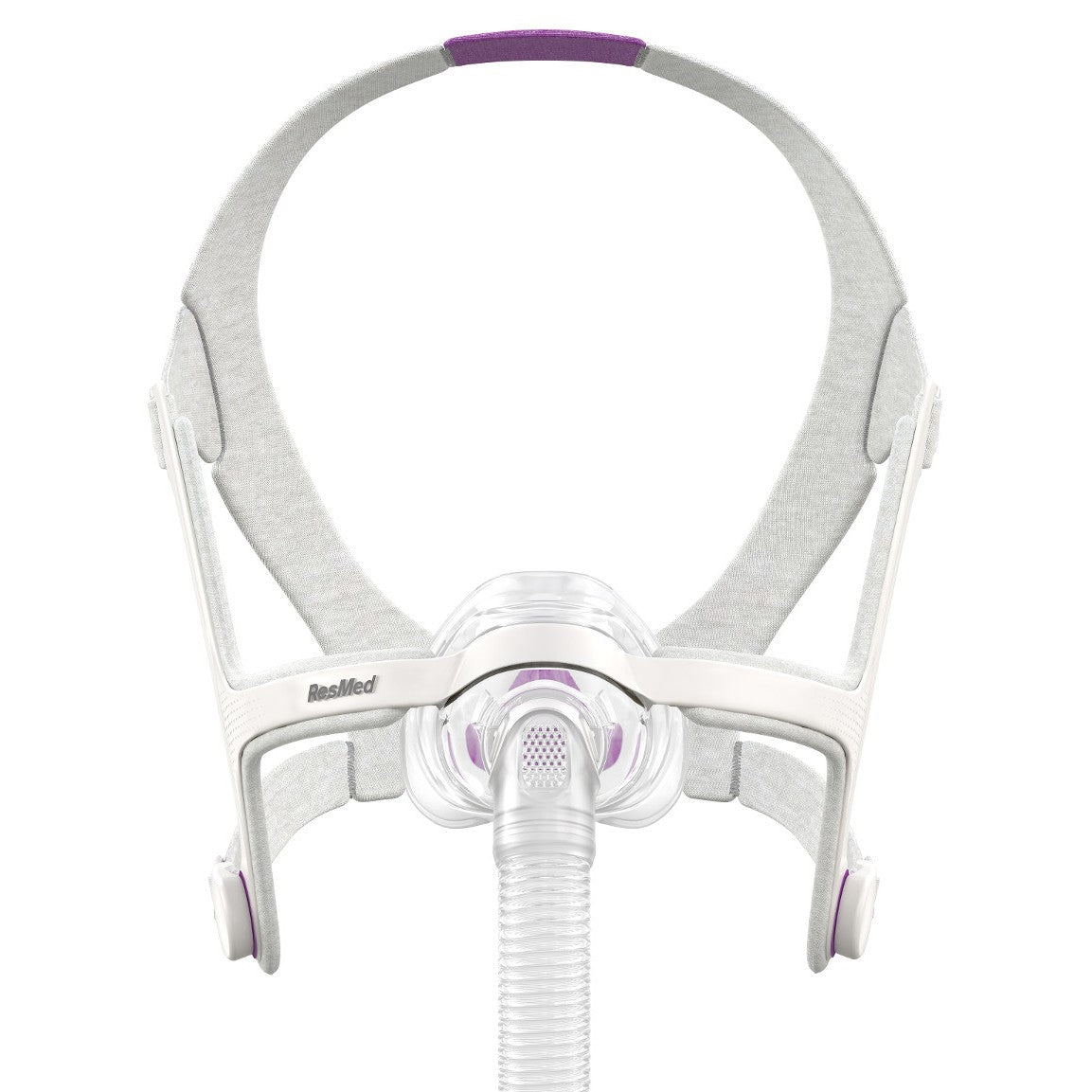 The AirFit N20 For Her Nasal CPAP Mask is designed exclusively for women, with a small cushion, plush materials, and violet-hued embellishments throughout the headgear.